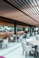 Ambiente sofisticado com uma figueira gigante no centro do salão.